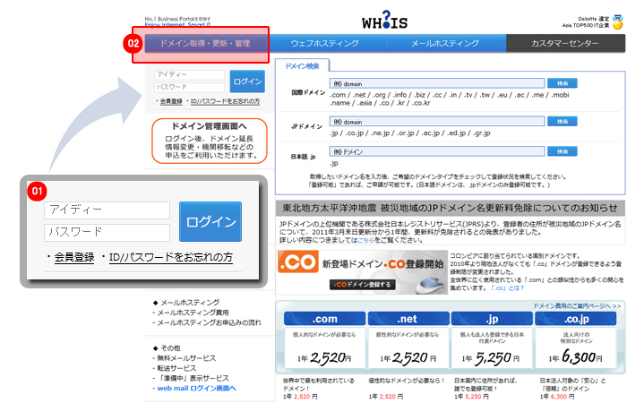 サイト上部のメニューから「ドメイン取得・更新・管理」をクリックします。 |