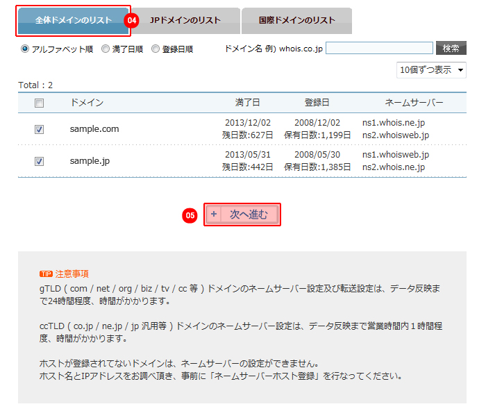 ネームサーバーの変更を行なうドメインのチェックボックスを選択して「次へ進む」ボタンをクリックしてください。 |