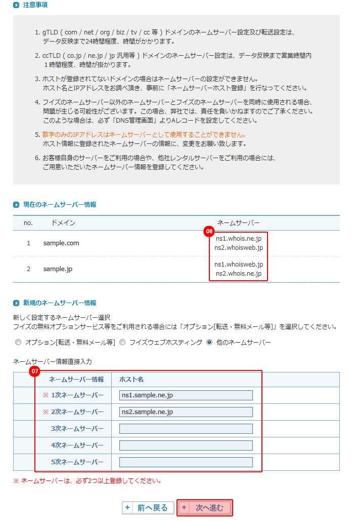 変更するネームサーバー情報を入力して、「次へ進む」ボタンをクリックしてください。 |