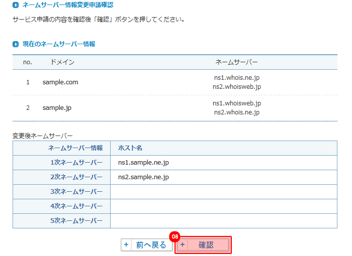 現在のネームサーバー情報が表示されます。 |