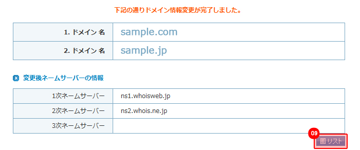 「リスト」ボタンをクリックすると、ネームサーバー変更リスト画面へ戻ります。 |