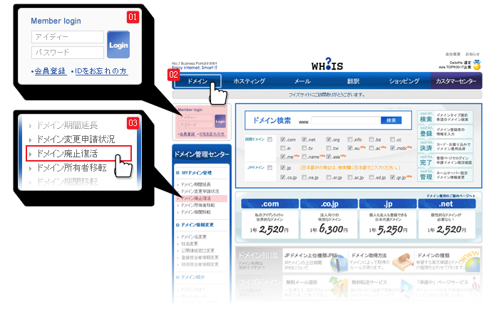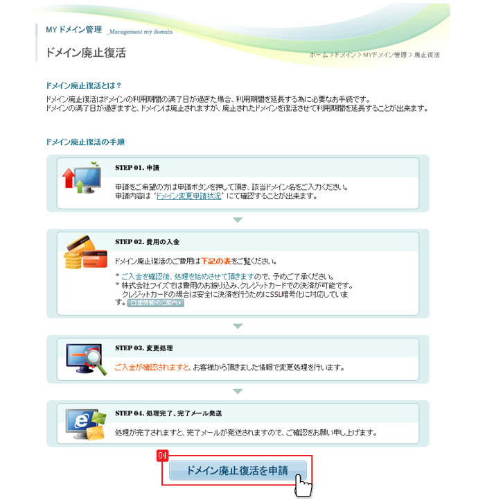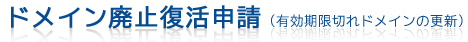 ドメイン廃止復活とは、ドメイン利用期間の満了日を過ぎた場合、利用期間を延長する為に必要なお手続です。 ドメインの満了日を過ぎるとドメインは廃止されますが、一定期間内であれば、廃止されたドメインを復活させて 再度利用期間を更新することが出来ます。 お手続きには、手数料と延長費用が必要になります。 廃止復活可能期間は、ドメインの種別ごとに異なりますのでご注意ください。 廃止復活可能期間 ・属性型JPドメイン 満了日から15日以内 ・汎用型JPドメイン 満了日から15日以内 ・国際ドメイン 満了日から30日以内