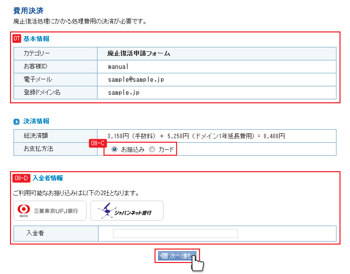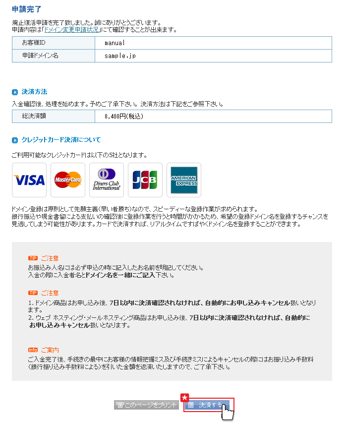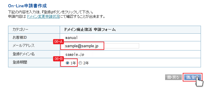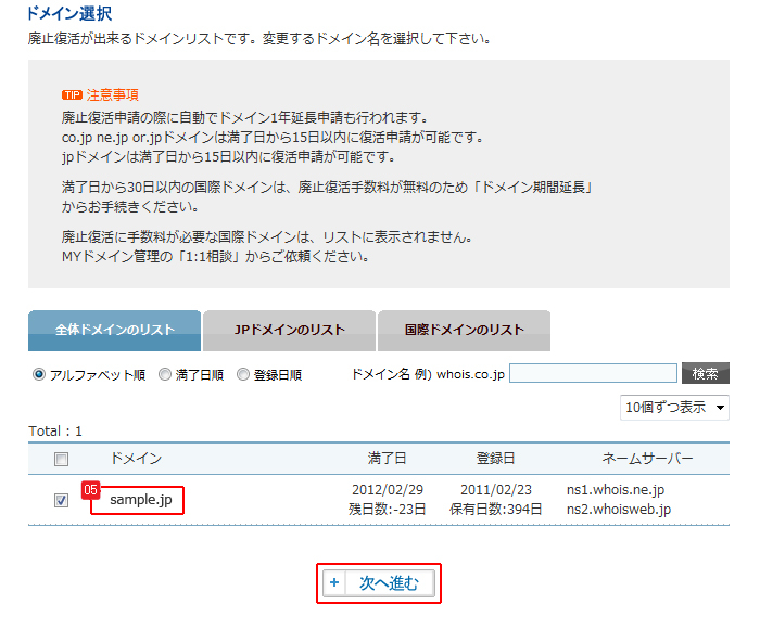 ※満了日から30日以内の国際ドメインは、廃止復活手数料が無料のため 「ドメイン期間延長」からお手続きください。 |