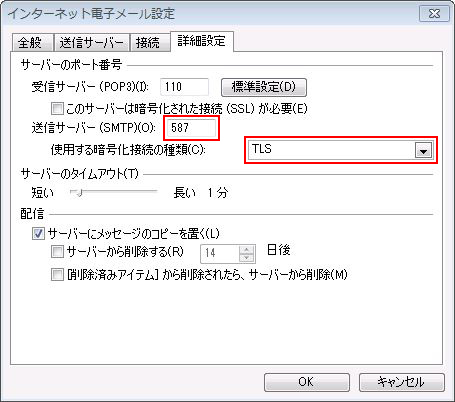 「詳細設定」タブをクリックして、送信メールサーバ(SMTP)のポート番号が「587」となっているか ご確認ください。 「25」になっている場合は、「587」に変更します。