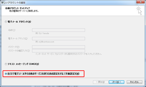 自動アカウントセットアップ > 自分で電子メールやその他のサービスを使うための設定をする (手動設定) を選択して、[次へ]をクリックします。