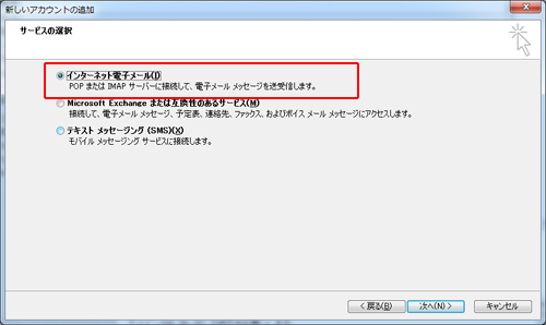 サービスの選択 > インターネット電子メール を選択して、[次へ]をクリックします。