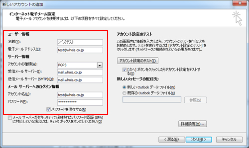 アカウントの設定を入力して、[詳細設定]をクリックします。