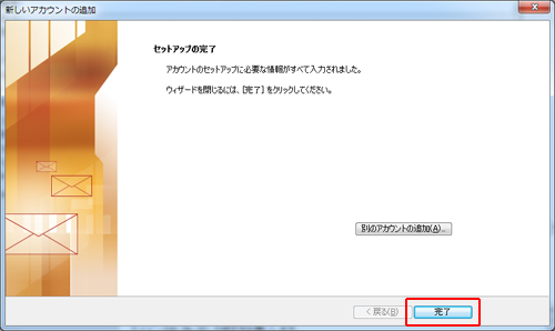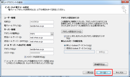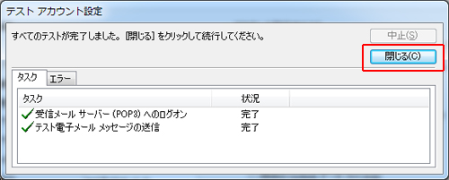 インターネット電子メール設定 > [次へ]をクリックし、送信/受信テストをおこないます。 問題がなければ、状況に[完了]と表示されます。