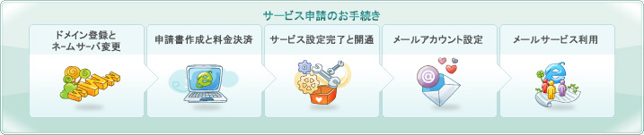 ドメイン登録とネームサーバ変更 申請書作成と料金決済 サービス設定完了と開通 メールサービス利用